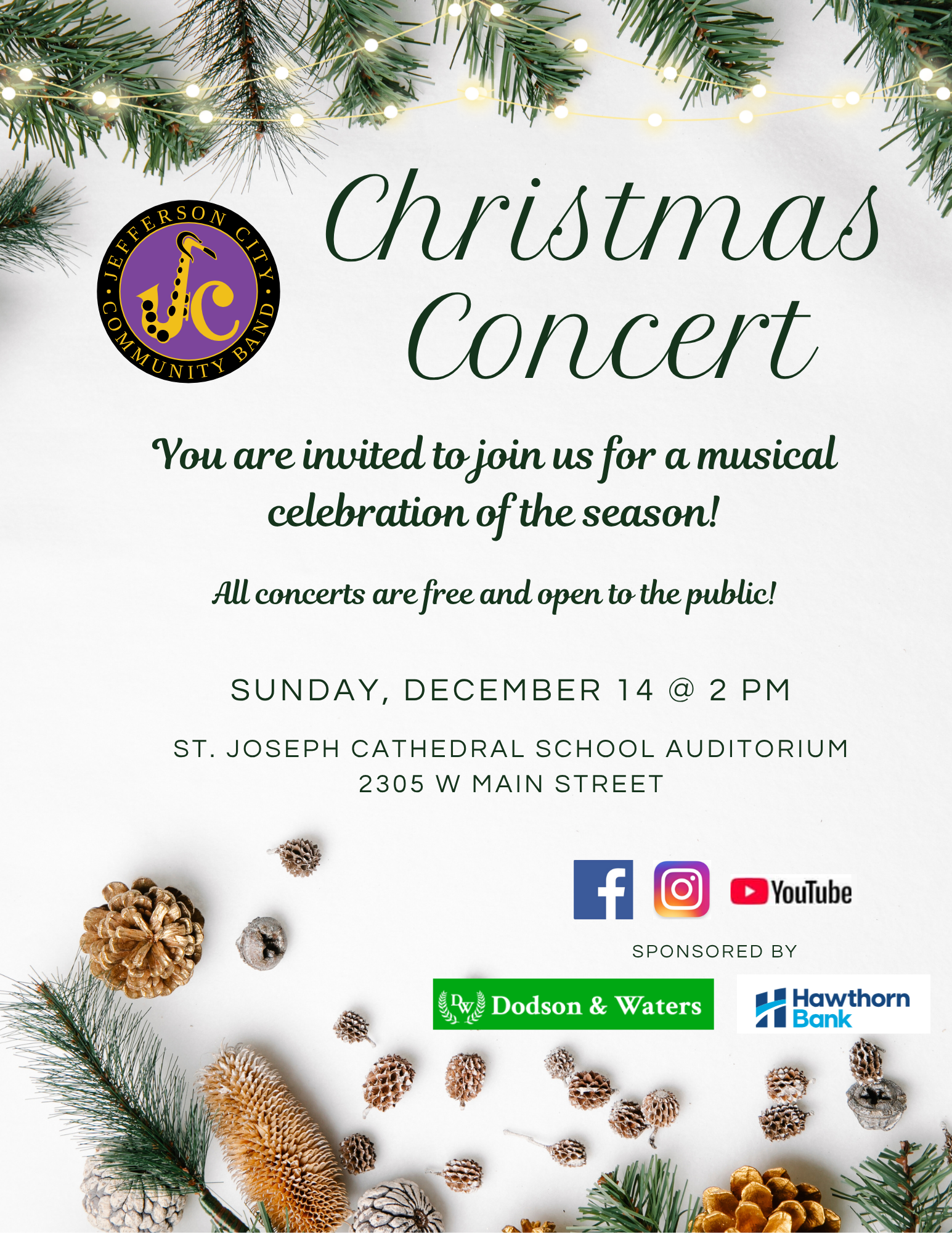 Join the Jefferson City Community Band for its Christmas Concert as we celebrate the season through music! Come and enjoy Christmas classics and more to get in the holiday mood! All concerts are free and open to the public.
